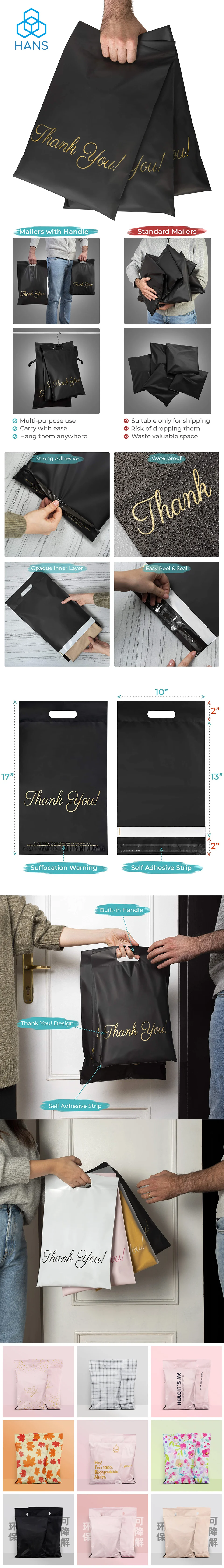 BUILT-IN HANDLE. Keep your work simple! With our poly mailers you can easily carry a bunch of packages in only one hand or hang your mailing bags on a hook. Don't need to hold them down and waste valuable storage space. Moreover, your customers will enjoy this feature helping them to carry the purchased products.